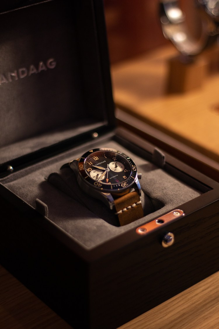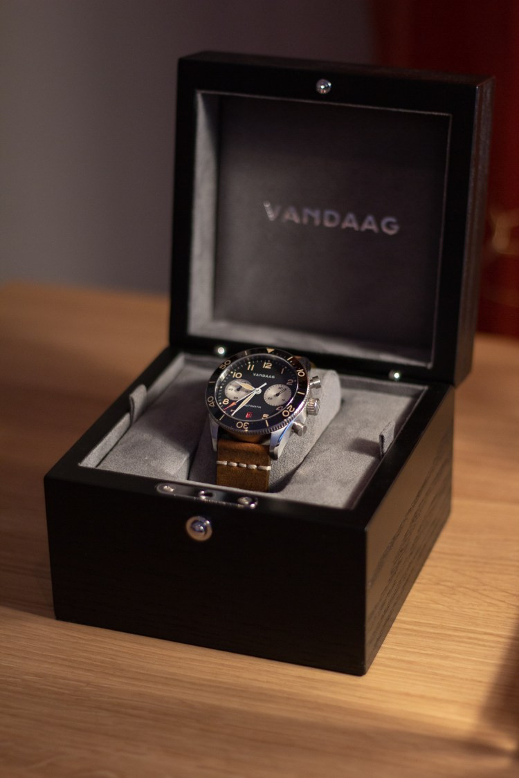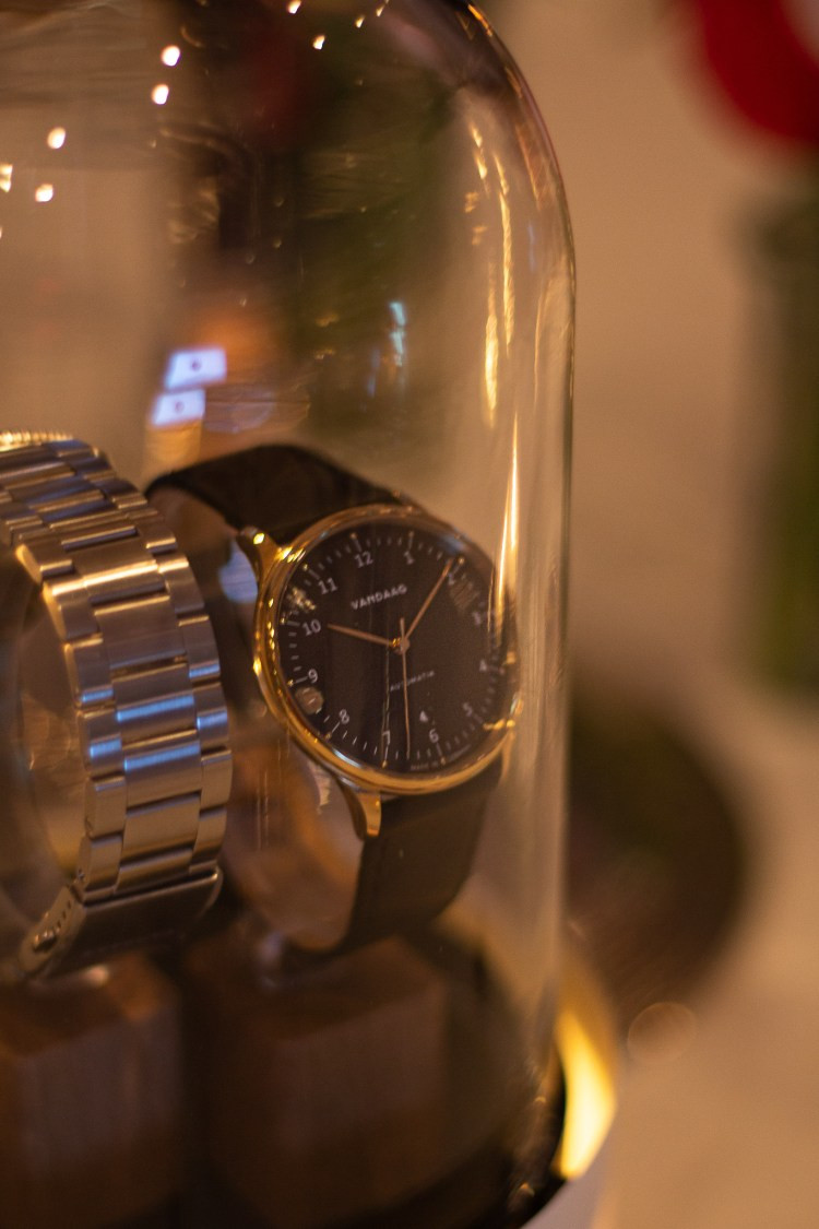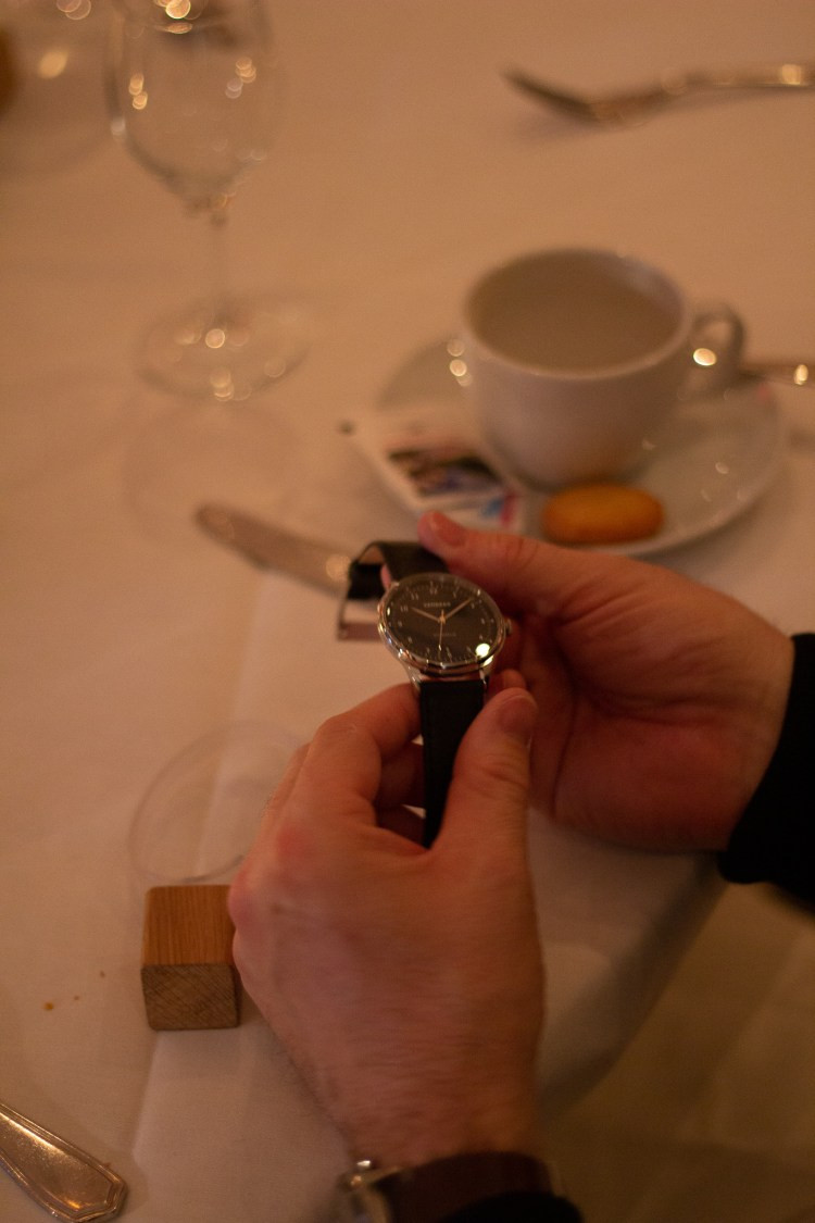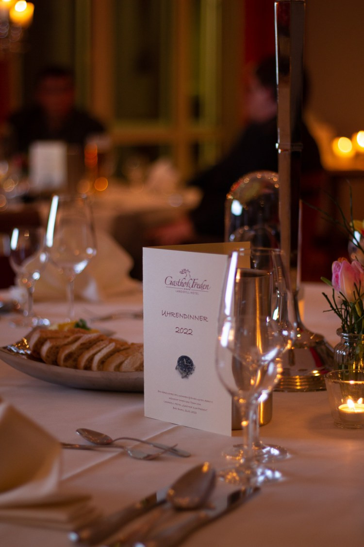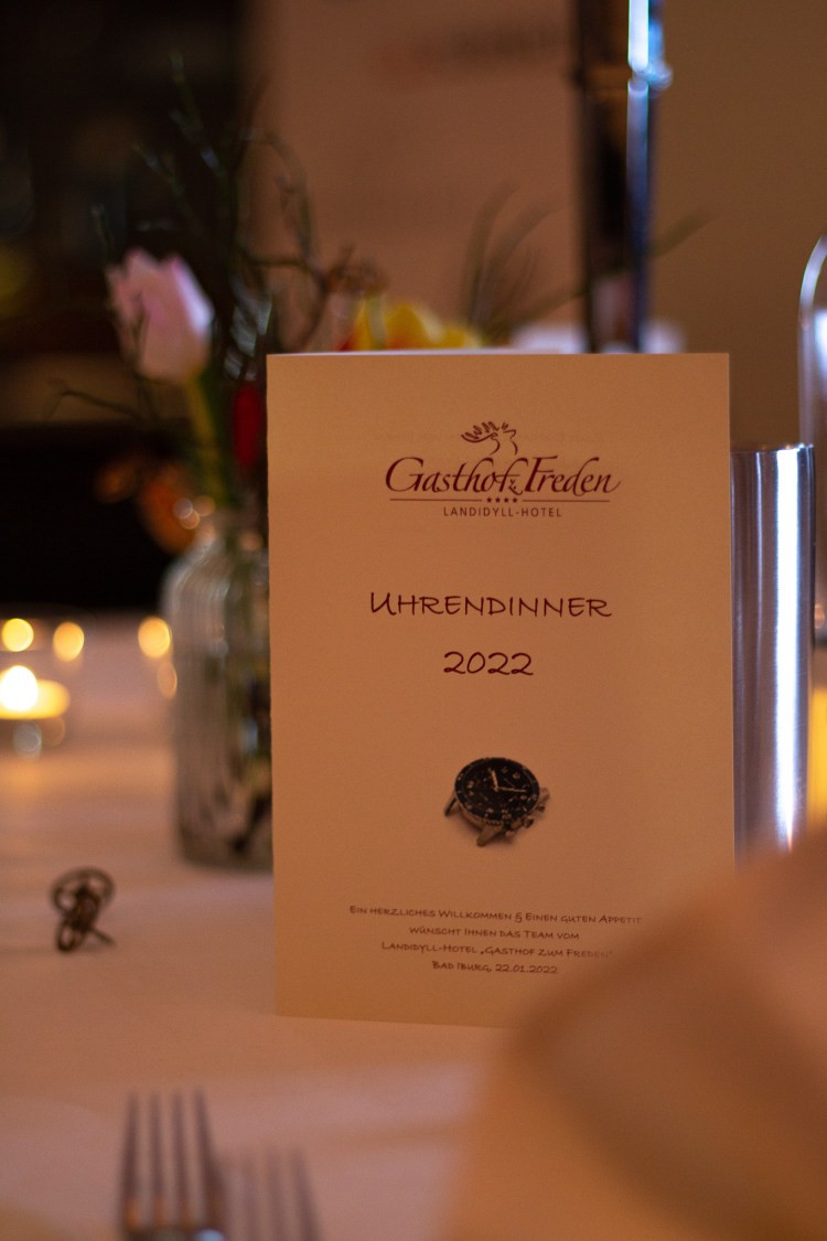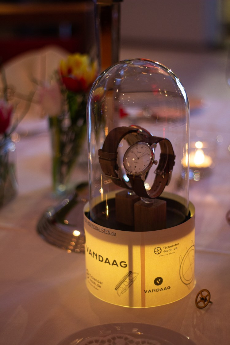 Bei dem Empfang der Teilnehmer am Feuerkorb wurden die ersten Gäste „warm“ und regten die Unterhaltung an. Zwischen den 4 Gängen des Menüs aus der Frischeküche vom Hotel zum Freden stellten die Macher und Inhaber von VANDAAG sich und Ihre Uhren vor.